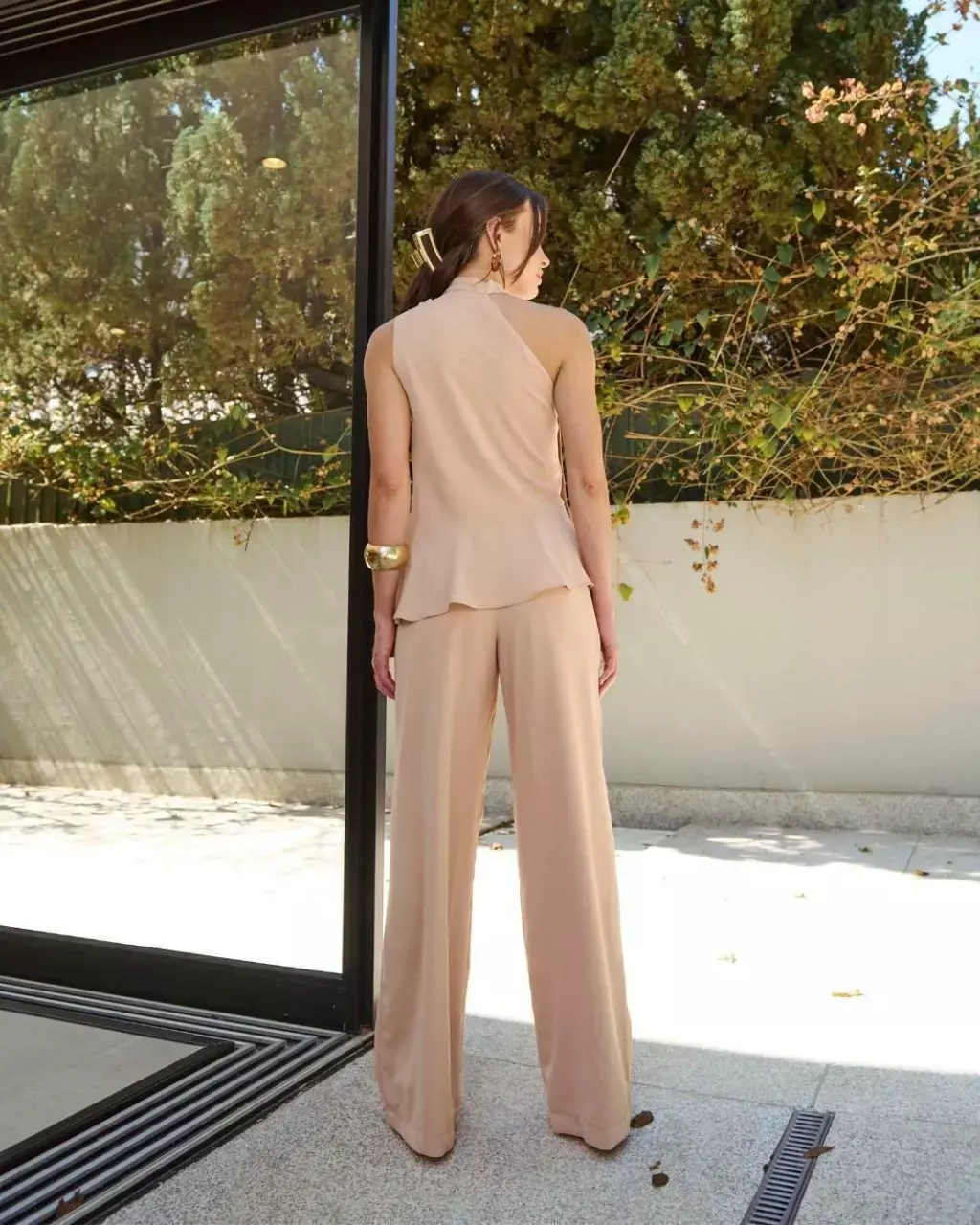 Conjunto confeccionado em tecido fluído, na blusa há um recorte assimétrico e na gola temos a opção de fazer uma variedade de amarrações. Calça com modelagem pantalona, possui forro, cós simples e bolso faca.